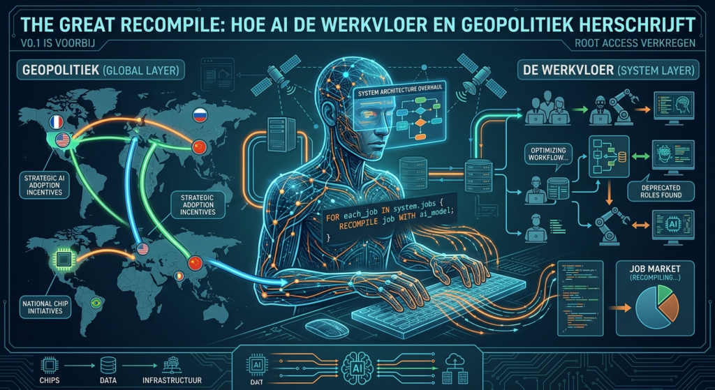 De AI-revolutie is de fase van vrijblijvende experimenten definitief voorbij. Wat we nu zien is een fundamentele herstructurering van de arbeidsmarkt, de wereldeconomie en de geopolitieke machtsverhoudingen. Dit zijn de vijf fronten waarop de strijd momenteel wordt uitgevochten: